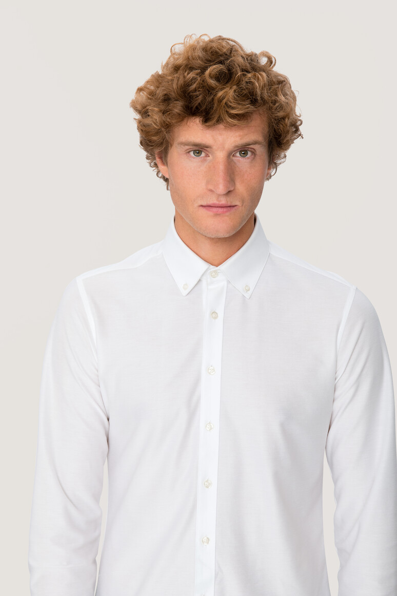 Modisches, langärmeliges Hemd mit Button-Down-Kragen, leichter Taillierung durch Abnäher im Rückenteil, leicht gerundetem Saum, weitenverstellbaren Manschetten, modischer Paspel aus dunkelblauem Satin an der inneren Kragennaht, hochwertig verarbeiteter Knopfleiste, doppelter Schulterpasse, 4-Loch-Knöpfen - über Kreuz vernäht und doppelt verknotet für extra festen Halt -, Ersatzknöpfen, und Doppelkappnaht an den Seitennähten. Hergestellt aus angenehm weicher und bügelleichter Jacquard- Maschenware aus einer strapazierfähigen Baumwoll-Polyester Mischung. Durch eine spezielle Stricktechnik wird eine natürliche Elastizität für einen ultimativen Tragekomfort erzeugt. Gewebtes HAKRO Necklabel aus hochwertigem Kettsatin mit weichen, ultraschallgeschnittenen Bandkanten für höchsten Tragekomfort.- Material: Jacquard-Maschenware aus 57 % Baumwolle und 43 % Polyester