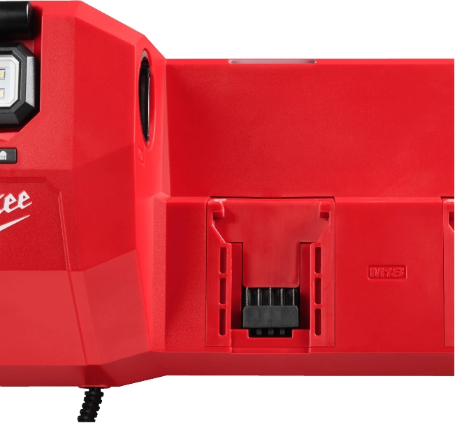 - Gleichzeitiges Laden von zwei Akkus mit Schnellladefunktion für M18™ und M12™, dann automatisches Umschalten auf die nächsten beiden Akkus